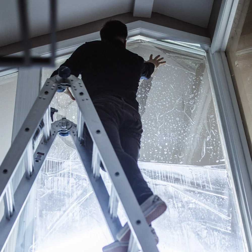 Person standing on a ladder inside a house applying protective or tinting film to a large triangular window with cleaning solution visible on the glass.